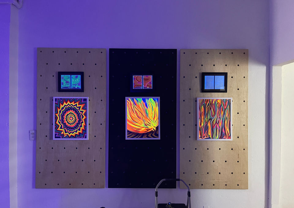 Each canvas was hand-painted with UV-reactive pigments, designed to awaken new layers of meaning under different lighting conditions. Visitors wandered through the glowing gallery, encountering symbolic figures, natural forces, and lucid visions that invited them to reflect on personal journeys of self-discovery.